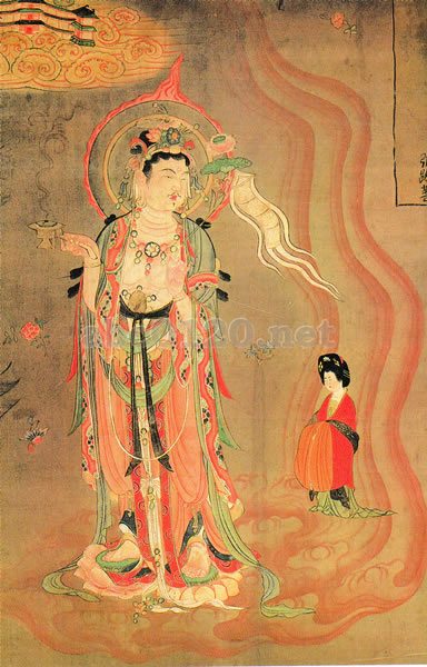 両面右上の短冊型に「引路菩」と記され,本図を含む一群の作品(大黄博物館2点,ギメー美術館4点)の名称の根拠となっている。右手に柄香炉,左手には白い幡を結んだ蓮華茎を執り,後を振り返る引路菩薩を画面中央に大きく描き,その後方には死者の魂とみられる俯加減の貴婦人が拱手して立っており,二人は種々の花が舞う中を雲に乗って進む。左上の黄色の雲中に建つ浄土に向かうのだろう。如意を思わせるような霊雲,香炉からの煙,火焔頭光,肩にかかる垂髪の表現等,諸所に様式化は認められるものの,引路菩薩・貴婦人ともに華麗な色彩を多用し,柄香炉,宝冠,装身具や頭飾に金箔を使用するなど技法的にも注目される大変保存のよい作品である。出所:大英博物館所蔵日本・中国美術名品展