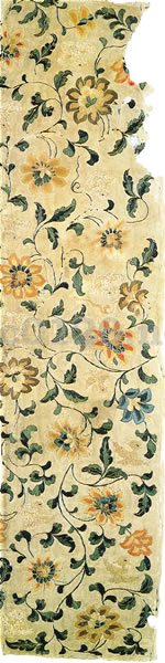花文を織りだした綾絹の裏に白の平絹を重ねて台地とし,繍技は前代に盛行した鎖繍を脱脚して,絹糸の光沢を充分に生かした平繍や繻子繍を主体とし,さらに小鳥には金糸の駒留,花,葉,茎の縁どりには銀糸の駒留の技法などが取り入れられている。特にここに見る平繍,繻子刺繍の繍法が,正倉院所蔵の天蓋の刺繍にみられる帛の両面に同一の文様を繍いだした「両面繍」と異なり,表の糸足が8~9 mm, 裏面の返しが1mm前後といった,いわゆる「渡し繍」になっていることが注目される。こうした繍枝の違いが軽やかな花唐草の表現を可能にしたものであろう。出所:大英博物館所蔵日本・中国美術名品展