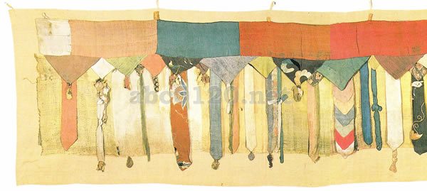 このような形式の垂幕は,石窟の壁面や祭壇・天蓋などに掛けられる荘厳具として使用された。スタインが敦煌第17窟蔵経洞より招来した垂幕三枚のうち,最も保存が良いのがこの一枚である。裂類には平絹の他,錦・刺繍・綾・羅・夾纈など各種の高価な染織品が含まれている。 上段の太い帯状の部分は白平絹・紅綾・縹平絹・赤色平絹などから成り,その下に三角状,ネクタイ状,あるいは結び飾りなどのさまざまな垂飾が下り,先端には花形や人形の飾りがつけられている。 袈裟が元来,喜捨された布帛の細片を綴り合わせて仕立てられたように,こうした垂幕も,喜捨された多くの布帛を集めて造られたものであろう。この垂幕も110枚以上の小片の帛で構成されている。