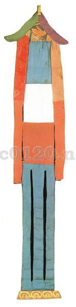 この幡は上端の吊輪から,幡足の下端につけられた板絵までそろった珍しい完形品である。幡頭は緑色の綾と紫平絹,二重の錦。幡身は藍三白と深紅の平絹。幡手は濃淡の赤色平絹。幡脚は一枚の藍色平絹に二本の切目を入れて,きれいに滕り縫いを施している。錦は細片であるが,いずれもぬ緯錦で,一片は濃紺の地に羽根を広げた鳥文様が織りだされている。なお同コレクション中に,ほぼ同形,同色の幡がもう一点あり,一対として用いられたものかと思われる。出所:大英博物館所蔵日本・中国美術名品展