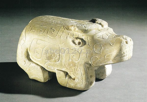 殷墟5号墓からも,これと同じ長さ25cmの水牛が発見されている。大理石製でやはり跪坐する姿であるが,眼,背部などに多少の相違もみられる。本品も安陽出土といわれているので,ほぼ同時代とみてよいだろう。出所:大英博物館所蔵日本・中国美術名品展