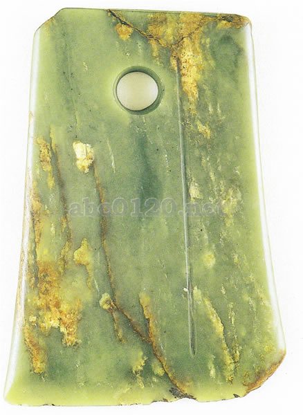 茶色と灰色の斑点やすじのはいった暗緑色の玉製。縦長の梯形を呈し,刃は直線状になり,上部に両面穿孔の円孔が一つあく。刃部と背の角が少し欠損している。
