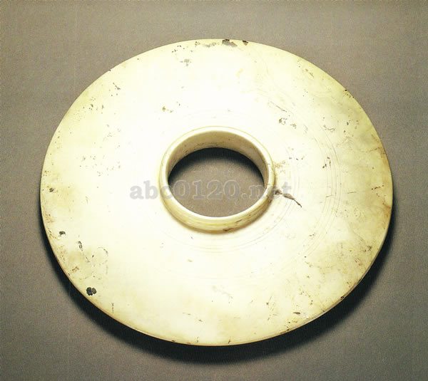 まだらに灰色のすじがはいる白色の玉製。中央の孔の縁には高さ2.2cmの突起がつく。肉の部分には,表裏ともに数本の細線で1組となる同心円文を2組めぐらしている。河南省安陽市の殷虚5号(婦好)墓(商時代後期)からも,孔縁に突起をもち,細線による同心円文をめぐらす玉璧が出土しているので,本品の年代もこの頃と考えられようか。