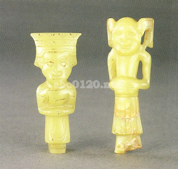 以上2点の年代を考える上で,河南省洛陽市の東郊外にある墓(西周時代)より出土した高さ7cmの玉人が参考となる。全体の形状は玉人(その二)に似ており,纒っている服は玉人(その一)に似ているので,両者の要素をあわせ持っているといえよう。他に類例として,ウインスロップ蒐集玉人がある。出所:大英博物館所蔵日本・中国美術名品展