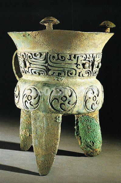 把手と3本の太い足を持ち,口縁の上には2本の柱が立つ。腰部には饕餮文と?文が浮形式に施され,腹部には冏文がめぐる。商時代には,祖先を祭る為の祭器として青銅容器が盛んに作られた。斝と呼ばれるこの器種は,酒を温めるものとされている。中国において青銅器は龍山文化の時代には既に知られており,ニ里頭期には青銅容器が現われ,二見岡期を経て,商時代後期である殷墟期には青銅器文化の一つの頂点に到達する。この斝は器形文様具にニ里岡期の特徴を示しており,類品が河南省鄭州や湖北省黄陂盤龍城遺跡から発掘されている。早い時期の青銅容器の例として貴重である。出所:大英博物館所蔵日本・中国美術名品展