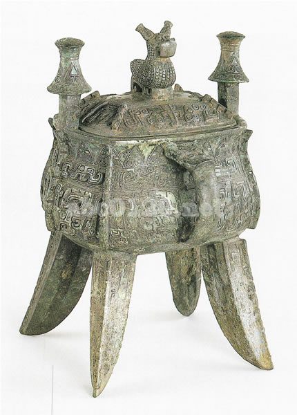 4足をもつ方形の斝。蓋の上には角のある鳥が置かれ,身の4側面には饕餮文,夔文が施される。斝は温酒器である。3足のものと4足のものがあるが,3足の斝の方がずっと多い。また蓋を伴うものは少数である。二里岡期に出現し,西周前期まで用いられた。出所:大英博物館所蔵日本・中国美術名品展