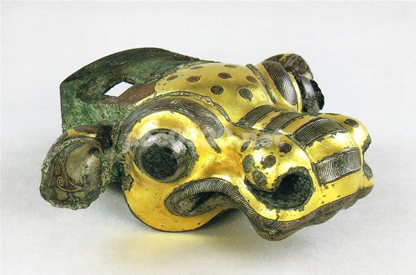 殷・周時代|金銀・玉器|>金銀錯獣首形飾金具 |