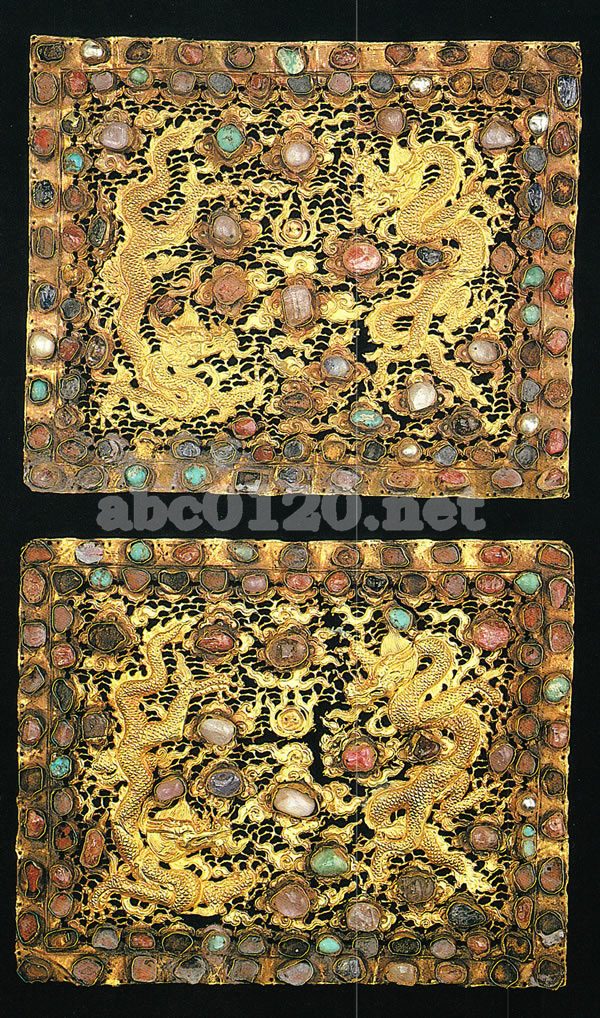 宝珠を中心に左右に五爪の龍配し,空間に霊芝雲を散らし,さらに霞文を透しであらわして地文とした矩形の金製の板で,2枚1貝になっている。各々表面の随所にトルコ石・真珠などの貴石を嵌め込み,いたって豪華につくってある。これが何に使用されたものか定かてはないが,仔細に見ると,2枚のいずれも外縁周囲に2点1組の小穴が30数個所もあけられており,あるいは衣裳に縫いつけた装飾具てあったものかもしれない。玉類は龍と宝珠を避けて嵌めこんであるのはよいが,霊芝雲の上に集中して嵌入されているため,せっかく丁寧に彫りあらわした霊芝雲のかたちがほとんど見えなくなってしまっているのは残念である。龍宝珠・霊芝雲などの文様は皇孫・言芝言なとの文様は明時代の永楽ないしは宣徳期の漆器のそれと酷似しており,この飾板の制作時期は15世紀前半と考えてさしっかえないであろう。手のこんだ明時代初期の金工技法をよく伝えた見事な作品である。出所:大英博物館所蔵日本・中国美術名品展