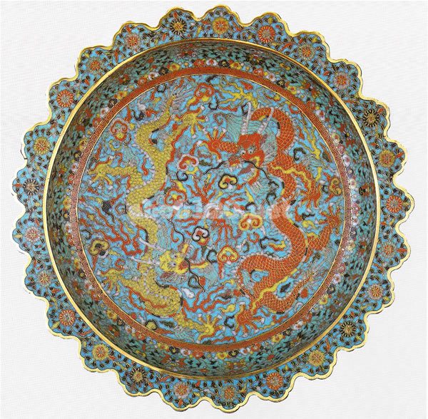 文様のなかで目を引くのはやはり,見込みにあらわされた龍の図であろう。宝珠を中心にして,左右に五爪の龍を配し,隙間に霊芝雲を散らしたこの構図は明・清の両時代の官製作品を通して旅行したものであるが,この盆にみる龍は同時代の萬暦期における陶磁器・漆器にあらわされた龍と酷似しており,盆の外底に大明萬暦年造の銘がしるされている通り,この作品は萬暦期に宮廷用としてつくられたものと言ってよいであろう。出所:大英博物館所蔵日本・中国美術名品展