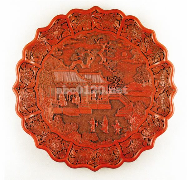 八弁の稜花形にととのえたやや大ぶりの盆で,低めの高台をめぐらしている。見込みには波文・霞文を地にして楼閣山水人物の景をあらわし,立ち上り内外面に椿・牡丹・蓮華・ 梔・菊など八種の花文を配している。底裏は黒漆塗りで,左方に「大明永楽年製」の針刻銘が記さの五字れており,また,中央に「内府甜食房」款填金銘がほどこされている。この盆の作風はまさに永楽期の堆朱のそれを示しており,楼閣・岩・松といった文様などの処理はまったく同じてあるといってよい。今日,永楽年間に官営工場で制作されたいわゆる官製の堆朱器は比較的多く遺こされているが,この稜花盆にみるような大形の盆はことのほか少なく,これを含めても僅か散点しか伝えられておらず,本品はそれだけにいちだんと稀少価値の高い作品になっている。出所:大英博物館所蔵日本・中国美術名品展