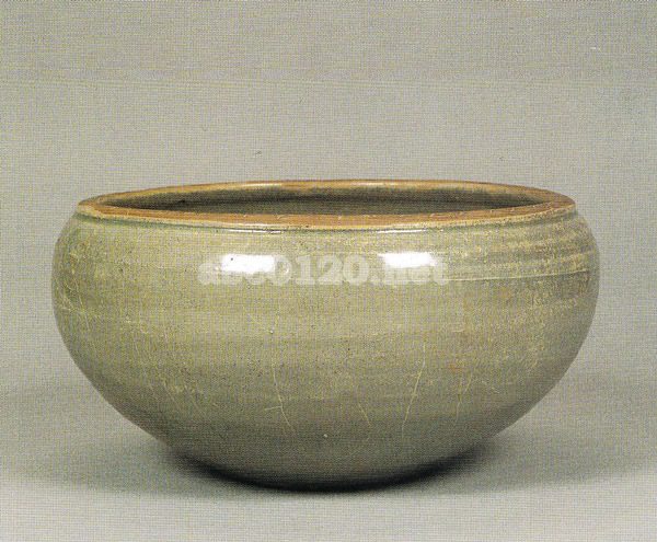 口縁部がやや内湾し、器腹が膨らみ、底部を浅く削り出している。内外面土もに施釉されている。釉色は「蟹殼青」色を呈し、全面に貫大が大る。胎土は灰色である。口縁部は露胎で、目跡が残っており、伏せ焼きによる焼成と考えられる。本器の造形は、唐時代の越州窯青磁鉢に類似している(『浙江青磁』図版35香港大学馮平山博物館1993年)ことから、当時の景徳鎮窯が、越州窯の影響を受けていたことがわかる。出所:皇帝の磁器-新発見の景徳鎮官窯