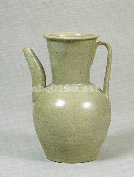 ラッパ状に開いた口縁部は玉縁とし胴部を瓜形に体る。かすかに湾曲した注口と、偏平な把手が付く。高台は厚体りで、畳付に目跡が残る。全面に施釉し、釉は「蟹殼青」色を呈す。釉中に骨灰が混じったため、釉の表面には特に柔らかな光沢が現れている。本器の造形・釉色には、越州窯の影響がうかがえるが、焼成技術は越州窯より優れている。 1.越州窯が焼台の上に支釘をおいてその上に直接器皿を乗せて焼成するのに対して、景徳鎮窯は焼台の上に盤形のハマをおき、ハマに支釘をおいた後、器物を乗せて焼成する。後者は、焰が下から上に向かって器体に直接あたるのを弱めたのである。2.越州窯の支釘は硅酸分か多い「断層泥」であるのに別して、景徳鎮窯の支釘はアルミニウム分の多い「高嶺土」である。後者は、焼成後に製品から剥がすのが容易である。出所:皇帝の磁器-新発見の景徳鎮官窯