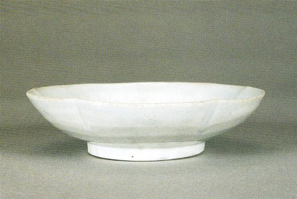 口縁部を五輪花に作り、器腹は浅くやや湾曲している。胎土は純白緻密で、釉はやや青みを帯びる。釉が流下しいわゆる「涙痕」が生じている。見込みは平らで目跡は認められない。高台は五武の青磁に比べて薄いが、目跡が残り、一点ずつ支釘を用いて焼成したと考えられる。この種の白磁は、楊楊ず・湖田・黄泥頭などの窯址でよく見られる。すべて五代の青磁の堆積層より出土するので、五代から宋初にかけての製品と考えられる。