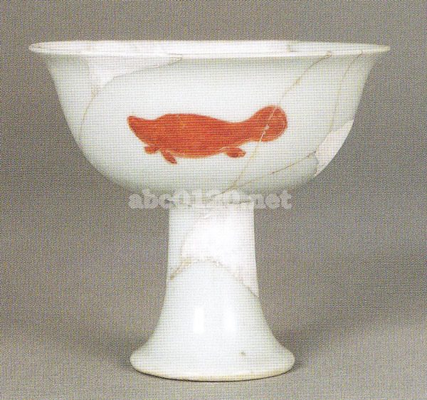 明・清|陶磁器|>白磁紅彩魚文高足杯 |
