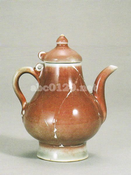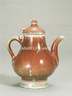 器身は梨形をし、高台は外反する。把手と頸の接合部に、紐通しが付く。蓋には宝珠形の鈕が、縁には紐通しがそれぞれ付く。高台は透明釉が掛けられ、高台内には二重円圏内に青花で六字銘が記される。紅釉が滲じんだり、灰緑色を呈したりしている原因は、窯中の温度に非常に敏感なためである。出所:皇帝の磁器-新発見の景徳鎮官窯