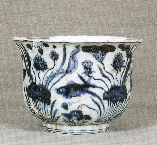 口縁部は外反し、器腹は深い。「金鐘碗」の形をしているが、器身は多稜形である。外壁には青花で蓮花・水草・浮草文等が、その問に四尾のそれぞれ異なる魚がのどかに泳いでいる姿が描かれている。見込みに蓮池魚文が配される。底裏には二重円圏内に六字銘がある。この器はイスラムの金属器写しの作品である。出所:皇帝の磁器-新発見の景徳鎮官窯