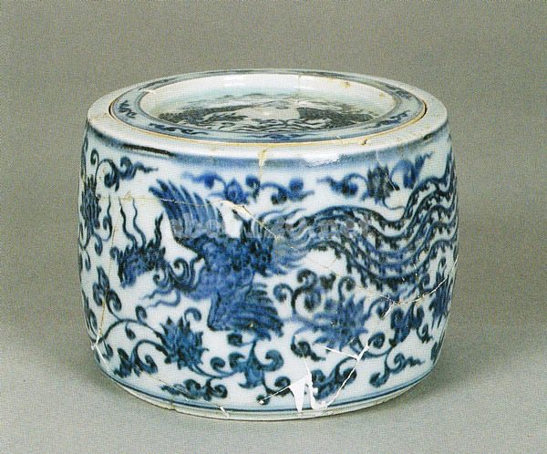 器身は円筒形をなし、あわせ口作りで高台がつく。蓋の中央には、紐通しとして小さな孔をあげている。蓋をすると、身の口と蓋との合わせ目はぴったり合う。「蟋蟀譜』ではこの種の壺を「坐蓋式」と称する。外壁には花唐草の間に鳳凰を配す。鳳凰の姿は鶏頭に細頸、尾は一羽を綬形に、一羽を唐草形に描き、即ち、一鳳(雄)一凰(雌)となる。蓋には、向かい合う鳳と凰を描き、六字の横書銘がある。器身底裏にも六字の縦書銘が記される。器内面は全面施釉されている。このように、二つの銘款を一つの器に記す例は、宜徳期には非常に稀である。出所:皇帝の磁器-新発見の景徳鎮官窯