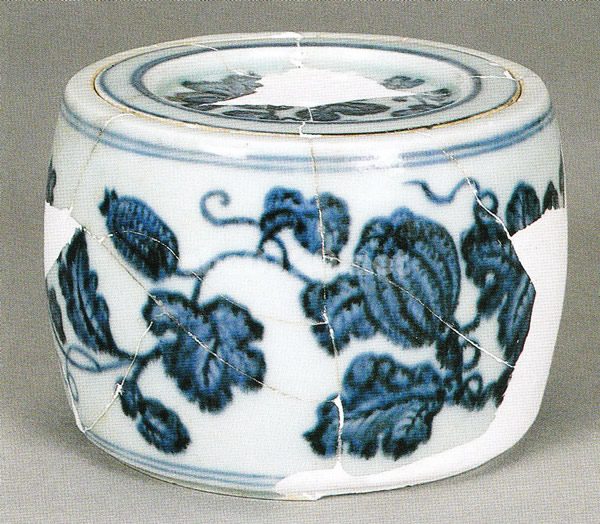 瓜と蔓はからみあっており、大小二つの瓜は瓜蔓の間に実を結び、大きい方は瓜、小さい方は瓞と呼ぶ。この図柄は「綿々瓜瓞」と名付けられ、「子孫繁栄」の意味を表している。銘款はない。この種の青花蟋蟀壺には、在銘と無銘の二種があり、その違いは、無銘の器の高合壁が厚いという点にある。