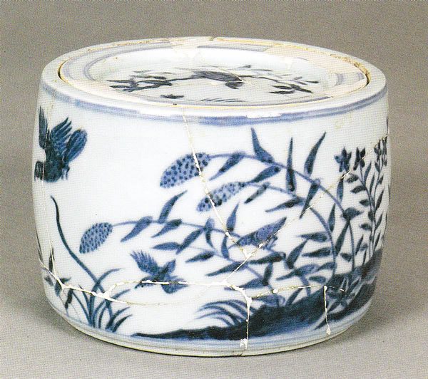 水辺には草が密生し、二羽のカワツセミはミズタデの中に姿を隠している。空中では、雄壮な大鳥が二羽の小鳥を追っている。水辺という情景から、追われる小鳥は雁の一種で、鈎代の爪と嘴を持つ大鳥は、水鳥捕りに長ずる鷺の一種であろう。蓋には草叢に隠れて樹上の小鳥をねらう犬と、その人を警戒する小鳥の様子を描いている。実に生き生きとした狩猟図である。在銘品である。この器の文様は、"青花鳥樹文蟋蟀壺"、と同様浙派の画風を示しており、原図は宮中の浙派画師の手によると考えられる。出所:皇帝の磁器-新発見の景徳鎮官窯