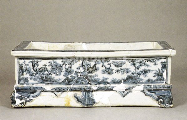 長方形の器形で、器体は重厚である。器内には施釉をし、一箇所に「~」形の仕切り板が設けられ、盆を二分する。仕切り板の下には排水孔があけられている。器底の六足は浮彫風に如意頭形に作られている。器底は露胎で、淡紅色を呈している。折縁の口縁部には、唐草文が廻らされる。四面の側壁はいずれも圏線二本で枠取し、内部に松竹梅文を描き入れる。胴部裾には雷文帯を廻らせる。明代の成化、弘治時期の宮中の絵師・呉偉(1459~1508)の「武陵春図』中に描かれた花盆の内部にも「~」形の仕切り板があることより、この盆は成化の宮中の盆景盆であると考えられる。出所:皇帝の磁器-新発見の景徳鎮官窯