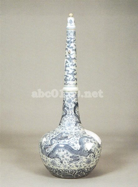 丸口に、長い頸と球形の腹部をもち、輪高台をなす。蓋のつまみは宝珠形である。底裏は露胎である。頸には小さな紐がつく。長頸は、突起した弦文で二段に分けられる。上段には雲文を描き、口縁には唐草文を飾っている。下段と腹部には、宝相華唐草の間に双角五爪の二龍を、胴部裾には波濤文を廻らせる。蓋には雲文が描かれる。蓋と身は合いロ作りになり、ぴったりとあっている。珠川出土の同種の瓶には、頸部の鈕が突起弦文帯の上に付き、成化在銘のものもある。この器は無款である。器形は、大阪市立東洋陶磁美術館蔵の高麗の12世紀の青磁象嵌鶴首瓶に似ている。「李朝実録」に「皇帝喜朝鮮献物、親執玩賞、凡可之之物、懸帯帯上」とある。この鶴首瓶の制作は、成化帝の審美趣味が朝鮮文化の影響にあることを表すといえよう。これは中国と朝鮮の文化交流を研究する上の実物資料と言える。