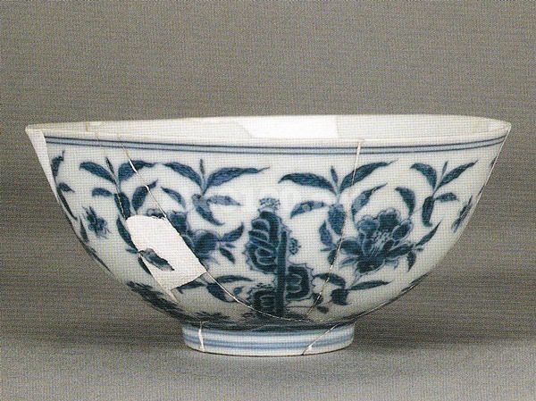 内壁は無文で、外壁には山石花卉文四組が描かれ、それぞれの間には、空に舞う蜜蜂一匹が描きいれられている。底裏には、二重円圏内に二行の六字銘か記されている。出所:皇帝の磁器-新発見の景徳鎮官窯