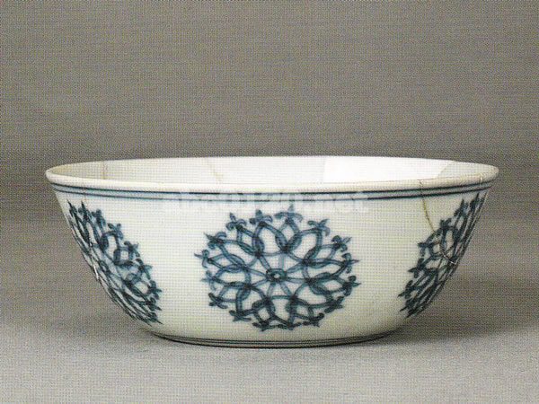口縁部はわずかに外反し、器腹は浅く弓なりをしている。底部は碁笥底に作られる。見込みはやや盛り上がり、内壁は無文である。外壁には六組のアラビア花文が描かれている。底裏には、二重円圏内に二行の六字銘が入っている。出所:皇帝の磁器-新発見の景徳鎮官窯