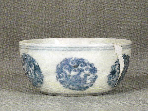 碁笥底と直立する口縁部をもつ杯である。内壁は無文である。外壁には、宝相華を口にくわえた団夔龍文六組が描かれている。文様は青花で輪郭を描き、それに談い青料を塗りつめている。淡雅でありながら、やや形式化されている。出所:皇帝の磁器-新発見の景徳鎮官窯