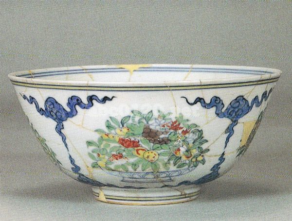 外壁は、「工」字形如意頭文によって、器面を四分する。その間には、花果を大盆に盛った図を、紅・黄・緑・紫彩などで描く。見込みにも同様の図が配される。底裏には、二重方圏内に青花の六字銘がある。この碗は、成化豆彩磁器の中で、色彩の最も豊富な例といえよう。この文様は、成化期に初めて磁器上に用いられた。明・劉若愚の『酌中心志」記載の「又御用監武英殿画士所作錦盆堆、則名花朶果…」とは、即ち、この図案をいうのであろう。清・朱琰の『陶説』に兄える「析枝花果堆四面」の「錦灰堆」は「錦盆堆」の誤りではないかと考えられる。出所:皇帝の磁器-新発見の景徳鎮官窯