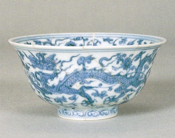 口縁部は外反し、器腹は弓なりをし、高台が付く。内外両面には、五爪龍がそれぞれ二体描かれ、余白には宝相華唐草があしらわれる。見込みには、宝相華唐草の間に蟠龍を配している。この器は、製作が見事で、器形も精巧であり、まさに珍品といえよう。底裏には二重円圏内に四字銘がある。出所:皇帝の磁器-新発見の景徳鎮官窯