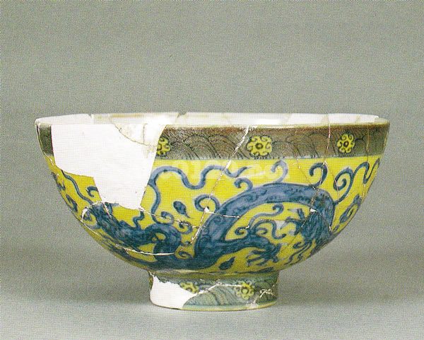口縁部は直立し、器腹は裾部に向かってすぼまり、高台が付く。形が蓮の実に似ていることから「蓮子碗」ともいう。内壁は無文で、外壁には、黄地に青花で二螭龍が描かれる。口縁と高台壁には流花文を描き、流水に緑釉を、花頭に黄釉を加えている。文様は生き生きとし、色彩は鮮やかで、「妙品」といえよう。底裏には、青花による二重円圈に四字銘が入っている。