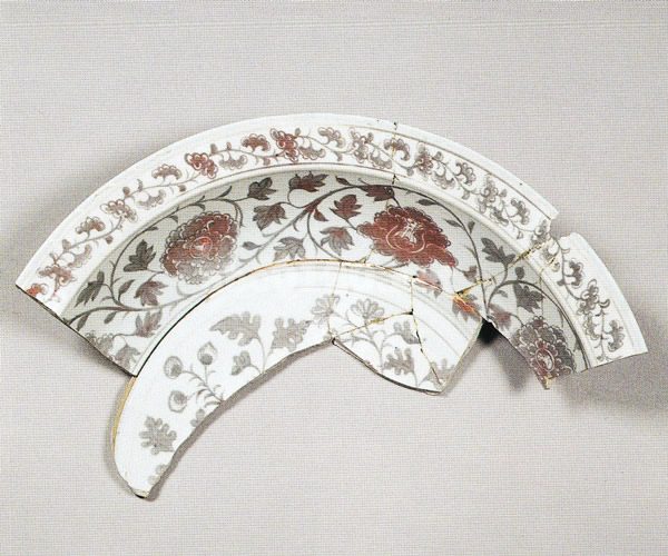 折縁で、器腹は弓なりをし、高台がつく。器底には砂粒が付着し、淡紅色を呈している。内壁には、釉裏紅で牡丹唐草文が描かれ、見込みに折枝菊文が配されている。折縁部に霊芝唐草文が廻らされる。外壁には菊唐草文が、胴裾にはラマ式蓮弁文が廻らされている。彩料の色は洪武風の暗灰色を帯びている。器形・文様が類似する青花の盤が、1994年に明御器廠址の洪武地層から出土している。この種の出土物の類品が、中近東に伝世する。出所:皇帝の磁器-新発見の景徳鎮官窯