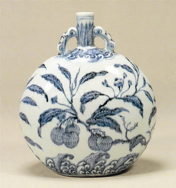細長い小さい口が全体の形を引き締め、ロから肩にかかる雲形の耳が、その緊張感をやわらげている。まるい扁平な胴は、なだらかで優美な曲線を見せている。この種の明初青花の扁壺は、世界的に見てもごく少なく、日本では数例に過ぎない。胴の前後には珍しく茘枝の折枝文があらわされ、肩と胴裾に波濤文、ロに蕉葉文が描かれる。出所:皇帝の磁器-新発見の景徳鎮官窯