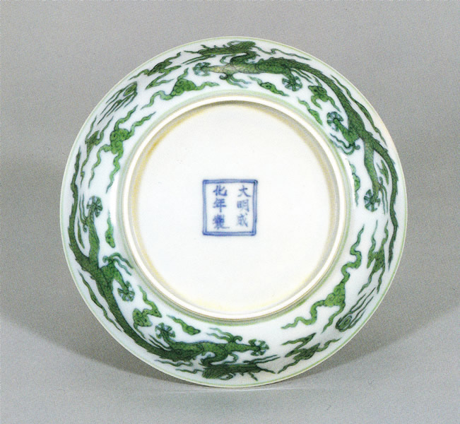 ロ縁端部が端反りになった平鉢。器壁は非常に薄手で、側面に一本鳥足がある。内側は無文で、外側に五爪の龍と霊芝雲・火焔宝珠を散らしている。施文は釉下に染付で構図を描き、緑釉で上絵付けしている。高台内中央に染付で「天明成化年製」銘が二重方圈の中に記されている。出所:皇帝の磁器-新発見の景徳鎮官窯