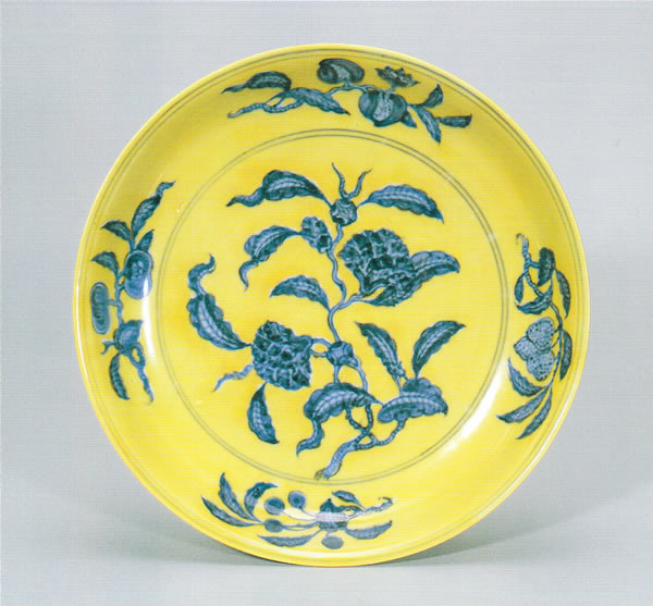 端反りの平鉢。内側の周縁に石榴・茘枝・枇杷・柿の四種の折枝図を配し、見込みに牡丹図を描いている。外側にも内側の周縁と同じ図を配している。釉下に染付で花卉図を描き、文様部分を除いて余白は黄釉で埋めている。外側面の口辺に楷書体で「大明成化年製」の銘が染付で横書きに記されている。高台内は釉がかからず銹釉が塗られ、チョコレート色に発色している。出所:皇帝の磁器-新発見の景徳鎮官窯