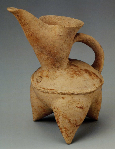 3足、嘴状の流(注ぎ口)を先端にもった細い頸部、把手から構成される鬹は、酒などの液体を注ぐための土器。黄河下流域の山東省一帯に展開した大汶口文化、龍山文化にもっとも集中してみられる。全体の器形は何とも可愛らしい印象を与える。しかし大きく張り出した流や頸部のある前方への重心の偏りを防ぐには、3足の配置や成形の時点で高度なバランス感覚が求められた。多くの鬹は、胴部に突帯がめくり、後方で把手の基部と重なる。胴部前面の中央や頸部の両側にボタン状の突起がつくことも少なくない。これらの突帯や突起は機能的には何の役にも立たないが、器表に貼りつける位置には規則性がある。あるいは象徴的な意味をもつ飾りであったのだろうか。