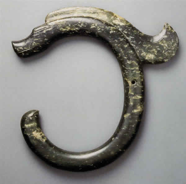 深い緑色をたたえた玉塊をC字形に丸彫りした後、ていねいな研磨と線刻を施して仕上げている。牛河梁出土の"玉龍"と異なり、目は大きく切れ長で、突き出た鼻の先端には一対の鼻腔かある。顎と額にはごく低い段が作り出され、そこに斜格子目状の線刻が加わる。首から背中にかけてはタテガミのような大きな装飾がそなわる。これを馬の頭部をもつ龍とみなし、"玉龍"のタイプの頭部を豚とみなす研究者もいる。本作品は玉龍のなかでも群を抜いて大きい。この顔のタイプは類例がまだ正式に報告されていないため、現時点で顔の形と大きさの関係を検討することはできないが、顔の形に応じて玉龍の大きさを変えていた可能性もある。紅山文化の玉龍は胴体の中央部に表裏両面から孔が穿たれていることが多い。紐をとおして何かに吊るした