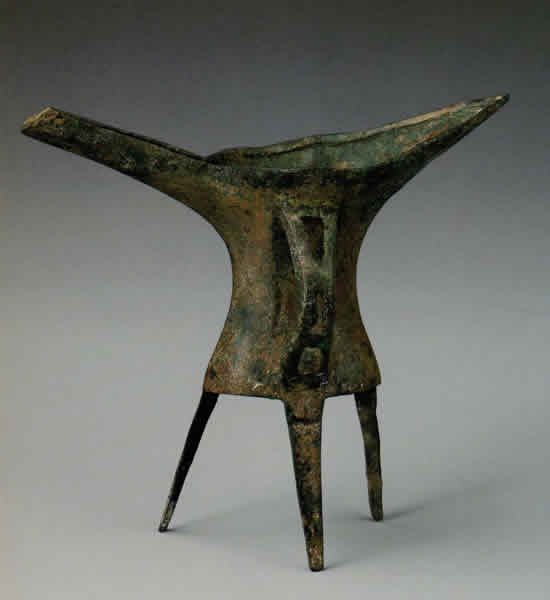 中国で作られた青銅器のなかで最古の一群に属する貴重な資料である。長く伸びた注ぎ口をもち、側面に把手を一つつけた平底の器で、3本の脚がある。こうした複雑な形は、N0.3などの新石器時代の土器から発展したものとみられる。火の上に置いて酒を温め、杯に注ぐ容器と考えられる。日常の食生活に用いる器具ではなく、神々や先祖の祭祀に用いられた祭器だったのであろう。