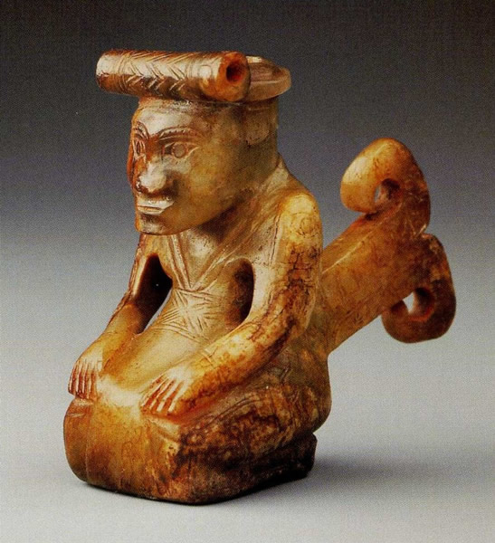 黄褐色の玉を用い、手をひざにのせて座る人物の姿を彫りあげたもの。長髪を編んで頭の上に巻き上げ、長い筒状の飾りをつけた冠を被っている。頭の上には孔が3箇所あり、内二つは穴の下が繋がっていて、ここに紐を通して吊り下げることができる。顔は長く、目と鼻が大きい。長袖の着物を着て、幅の広い帯を締める。足の指がみえないことから、靴を履いていると思われる。背中の中央左寄りの部分から柄のようなものがとび出しており、ここには蛇のような細長い動物の文様が刻まれている。