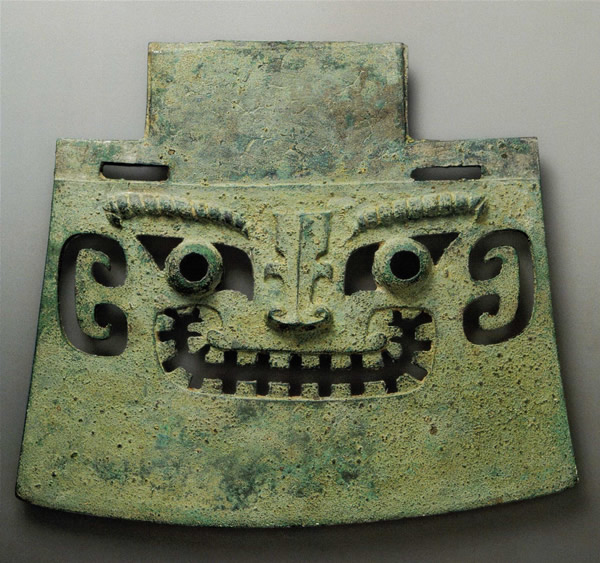鉞は木の柄につけて、生贄や罪人の首などを叩き切るための道具である。この鉞の両面には、大きな顔が作り出されている。歯を覗かせた□はつり上がっているだけではなく、両端が内側に抉りこむように裂けている。目は怒気をたたえて見聞かれているようであり、その中で環状の瞳が突出する。刻みの入った太い眉、上部が箆状を呈する不思議な形の鼻も、浮彫り状に鋳造して強調している。まるで裁きの権力を象徴するかのように威圧的な造型である。