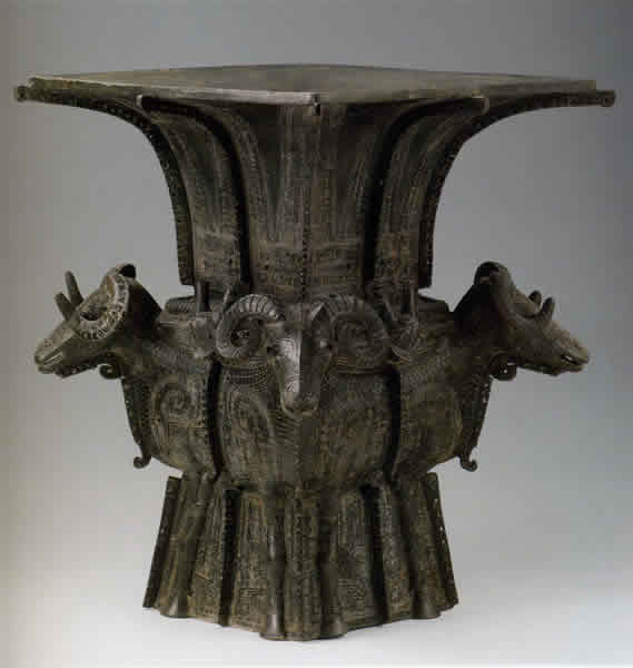 紀元前13世紀以降、商王朝の青銅器を祖形としつつも、長江流域などでは個性的な青銅器が作られるようになった。この四羊尊はその典型である。基本的な形態は商王朝の尊と共通するが、前肢から頭部にかけて羊をこれだけ大きく扱った装飾は稀有である。羊の顔面の渦状文による充填、下端が巻上がる縦方向の複雑なヒレ状装飾なども、商時代の中心地にはみられない。尊の胴部には鳳凰文が、張り出した肩部の上にはN0.19のそれと類似した龍の浮彫りが鋳造されている。頸部から口縁部にかけては、急激に外反する。複雑な立体造形と器面をうめつくす精緻な文様表現をこれだけ美しく鋳上げることは至難の業である。本作は商代青銅器工芸の金字塔といっても差しつかえない。これほど完成された青銅器が殷墟ではなく、遠く離れた長江流域で生産されたことの意義は大きい。出所:『悠久の美-中国国家博物館名品展』