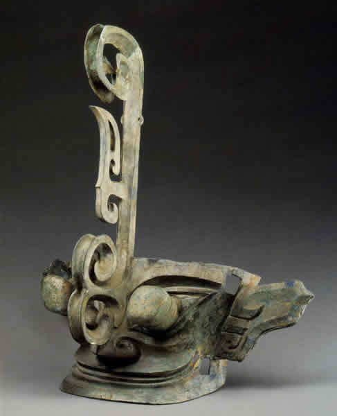 古代中国の青銅器は祭祀用の容器、武器が中心であり、人や神の身体・顔・目だけを表現した例はきわめて少ない。三星堆遺跡の1号・2号坑から出土した青銅器は、合計900点余りに達するが、そのうち容器はたったの20点であったのに対して、後者の青銅器は190点もあった。この突目面具は、特異な構成をみせる三星堆の青銅器のなかでもひときわ目を引く。耳元まで裂けた口、鼻から外側に伸びる頬の隆起、横に開いたった耳、そして突出した丸い目からなる顔は、笑っているようにもみえる。額についた縦長の装飾については、龍をかたどっているとする解釈がある。装飾上端の蕨手状部分が龍の尾で、直線部分が胴体、突目面具の鼻梁と接している箇所が顔に相当するという。この説の当否はともかく、突目面具と同じ2号坑から出土した蛇形の銅器が、頭部を除いて、この装飾とよく似た形態であることは注目に値する。出所:『悠久の美-中国国家博物館名品展』