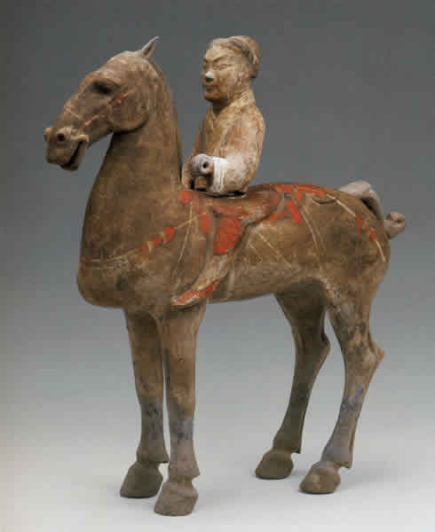 これに対して大きい方は団子鼻の丸顔で、靫はない。顔の造りや装備の違いを意識して、騎兵俑の大小を分けていたことになる。報告によれば、騎兵俑の9割以上は甲冑を着用していない。 しかしこの俑は太腿だけを赤い防具で覆っている。足を狙った歩兵の攻撃に備えたものであろうか。出所:『悠久の美-中国国家博物館名品展』