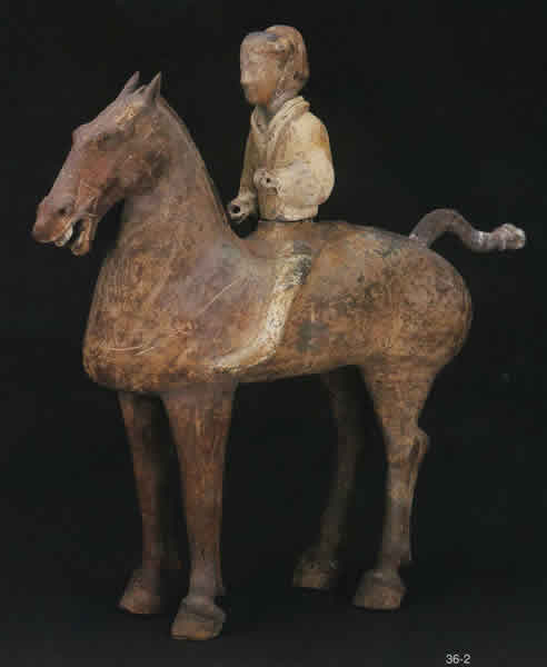 3体とも楊家湾の騎兵俑のうち、高さ65センチ以上70センチ未満の大きいグループに属する。片手で手綱をもち、反対側の手でもともと刀剣を握っていたのであろう。ただし武器は木で作られていたのか、残っていない。"騎兵俑"の馬の背中には「廿五」と記されているが、俑の背中にも、製作時に刻まれたと思われる記号や数字がある。騎兵俑の服装は後述の歩兵俑のものと基本的に変わらない。しかし戦袍(上衣)の丈は短めで、より騎乗に便利な作りである。馬の尾は紐で束ねられている。轡・手綱・鞍は、面繋・胸繋・尻繋などの組み紐によって馬の体にしっかりと固定されている。しかし,"青磁騎馬俑"の騎馬俑の鞍にみられるような前輪・後輪がつかず、鐙はまだ出現していない。当時の馬具はある程度の種類まで出揃っていたとはいえ、まだ過渡的な段階にあったことがうかがえる。出所:『悠久の美-中国国家博物館名品展』