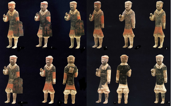 歩兵俑の右手には本来武器があったようである。その種類の特定まではできないが、赤い戦袍の俑(図1-7)は掌が若干開く(図ー8のみ例外)。一方で黒い戦袍の歩兵は右手を握っている。前者は幅のある武器を、後者は細めの武器をもっていたのであろう。このほか、赤い戦袍の歩兵は矢を容れる靫を背負うが(5)、戦袍が白いと靫がない(図ー9)。戦袍の色の差は、装備の違いとも関連していたに違いない。出所:『悠久の美-中国国家博物館名品展』