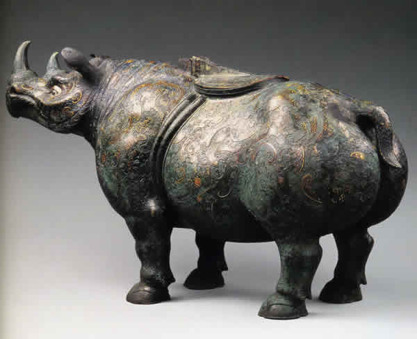 犀は何かに気づいたのか、首をわずかに左に曲げ、眼を見開いて前方を見つめる。ガラス製の眼とかわいらしい尾が全体を引き締めている。犀をよく知るものでなければなしえない見事な表現である。顔と体の全面に、凹凸と金銀の象嵌によって、幻想的な紋様を表わしている。これはこの犀が現実の生き物ではなく、神聖な存在であることを示している。すぐれた造形と華麗な装飾が組み合わさった、古代中国青銅器中の屈指の名品である。出所:『悠久の美-中国国家博物館名品展』
