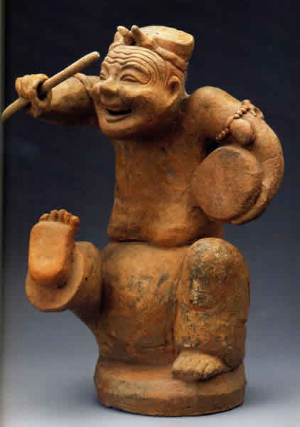 説唱俑とは、故事や物語を面白おかしく語り聞かせる芸人の俑。四川省の後漢墓からは、多彩な説唱俑が出土する。なかでも本作品は、とくに生気を感じさせる。脇に抱えた太鼓と足を挙げる滑稽な踊りで拍子をとりつつ、満面の笑みを観衆に振りまく。その様子は物語の佳境へと観衆を誘うかのようである。頭巾、腕飾り、長ズボンを身につけて、半裸に裸足といういでたちも微笑ましい。当時の兵馬俑、侍従俑などは型から同じものを大量生産したため、表情がはっきりしない。対照的に、説唱俑の豊かな表情や臨場感は型作りだけでは表現できない。粘土の貼りつけや彫刻などの技法も用いることで、細部までていねいに仕上げている。出所:『悠久の美-中国国家博物館名品展』