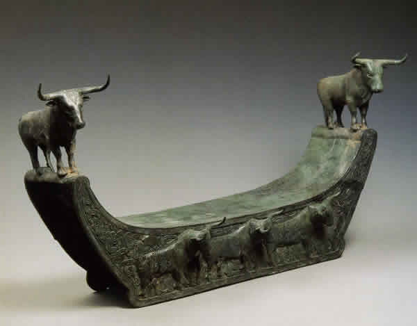 この作品は左右の両端に2頭の牛の立体像、片面に3頭の牛の浮彫り像が飾られている。いずれも立派な角をそなえた堂々たる立ち姿である。身体には幾何学的な文様が充填されている。滇文化の青銅器には、このような牛の立体装飾がしばしばみられる。とくに立体像による青銅器の装飾を開始した当初の段階は、その意匠のほとんどが牛で占められていた。 もともと滇文化では牛が突出した扱いをうけていたことがわかる。しかしその後、虎や鹿といった他の動物像や騎馬人物像などが立体装飾として頻繁に作られるようになると、牛に対する絶対的な扱いはみられなくなった。出所:『悠久の美-中国国家博物館名品展』