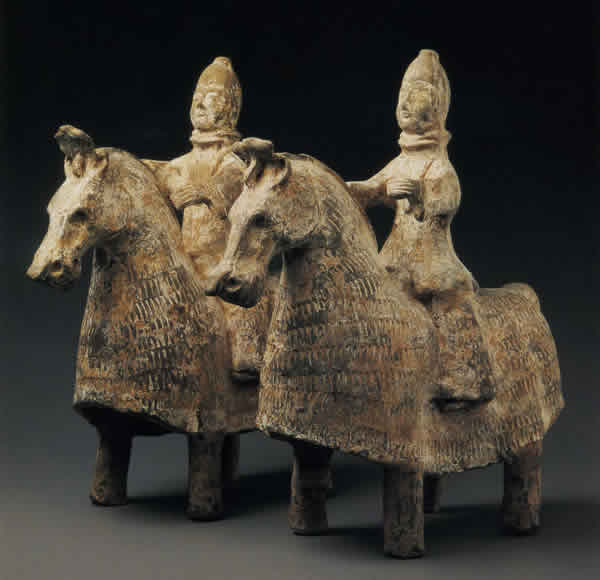 この2体の騎馬俑は型から起こして成形されたもので、めりはりのきいた造型ではないが、かえって素朴な味わいが騎兵の剽悍さを引き出している。出所:『悠久の美-中国国家博物館名品展』
