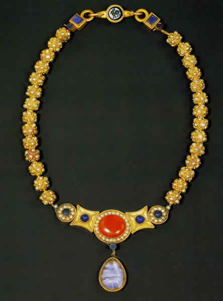 この首飾は、金の地金に、真珠やラピスラズリをはじめ、色とりどりの宝石がふんだんに散りばめられ、新品かとみまがうほど、まばゆい輝きを放つ。細かな金粒が各部の表海に溶接されているのは、古代地中海沿岸地域から系譜をたどることができる高度な技法の一つである。金や宝石を多用したこのような宝飾品は、これまでのところ中国では隋時代以前の類例が知られず、西方的な趣が色濃い作風に照らして、西アジアで制作されたとする説が有力視されているが、中国製の可能性もなお考慮される。いずれにしろ、次代の唐時代にかけて隆盛をみる細緻と贅を尽くした金銀宝飾品の先鞭として、きわめて高い価値をもつ。
